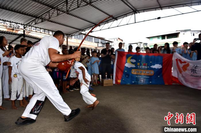 當(dāng)?shù)貢r(shí)間3月23日,巴西里約熱內(nèi)盧石頭河社區(qū),巴西“戰(zhàn)舞”舞者為來自加拿大的華僑華人小朋友表演?!≈行律缬浾?林春茵 攝