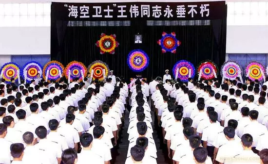 2001年4月26日,海南三亞,海軍舉行海上祭奠“??招l(wèi)士”王偉烈士活動。