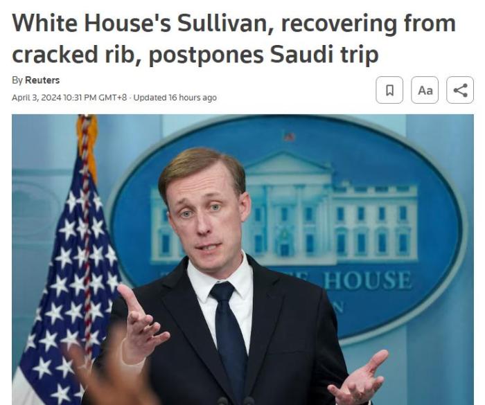 中新網(wǎng)4月4日電 據(jù)路透社報道,白宮當(dāng)?shù)貢r間3日表示,美國總統(tǒng)國家安全事務(wù)助理沙利文肋骨骨折,目前正在康復(fù),其原定本周前往沙特阿拉伯的計劃因此被推遲。