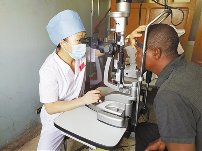 中國專家正在為貝寧當(dāng)?shù)鼗颊哌M(jìn)行眼科檢查。