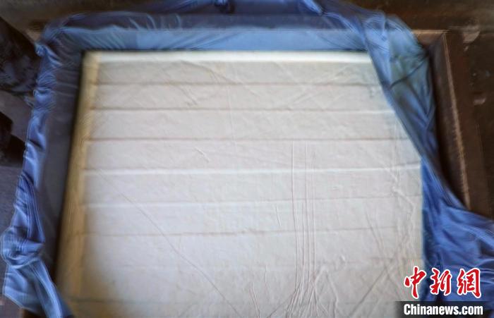 豆?jié){與石膏相遇,化學反應(yīng)后,豆香味縈繞在鼻尖,香氣彌漫在空氣中。這時,王志勇蓋上空隙均勻的木頭壓板,壓上石墩子,讓豆腐腦中的水分通過籠布和蓋板上的洞流走,等待豆腐壓好成型。