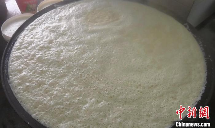 走進豆腐坊,在嗡嗡作響的機器聲中,一粒粒圓滾滾的黃豆在機器中翻滾著,進料口連接著高泉本地的泉水。機器轉(zhuǎn)動著,奶白色的豆?jié){緩緩從電動石磨上流了出來,匯聚到一口超大的鐵鍋中。