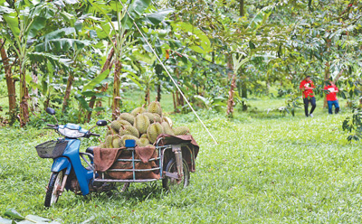 在泰國南部春蓬府的一家榴蓮種植園,工人將采摘下來的榴蓮裝到車上準(zhǔn)備運(yùn)出。