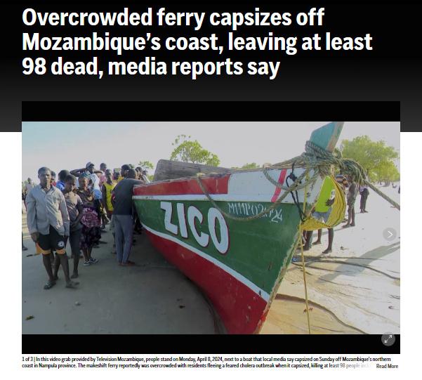 據報道,這艘載有約130人的渡輪7日在離開非洲東南部國家海岸前往附近的莫桑比克島后傾覆,目前已有至少11人住院。
