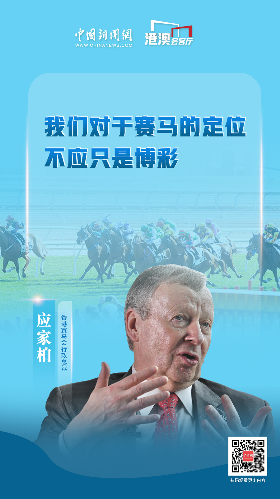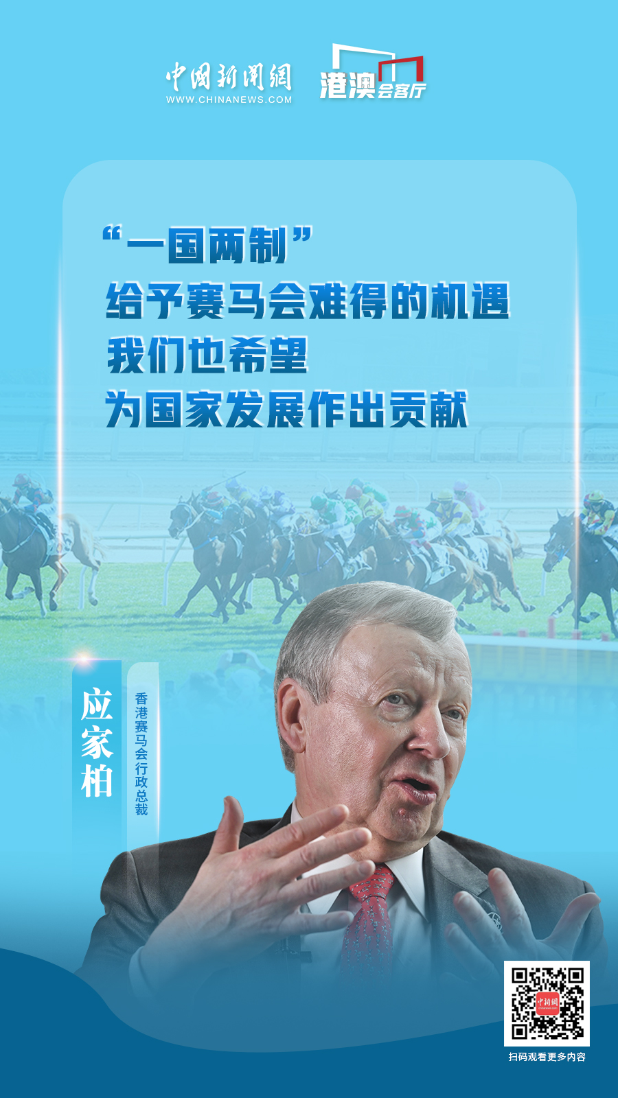 這是應家柏出任香港賽馬會行政總裁的第17年,亦是《粵港澳大灣區(qū)發(fā)展規(guī)劃綱要》發(fā)布五周年,他帶領賽馬會緊握機遇,從“一國兩制”優(yōu)勢,到粵港澳大灣區(qū)帶來的發(fā)展空間,繼續(xù)全方位地豐富著香港的賽馬精神。他如何看待香港賽馬事業(yè)發(fā)展現(xiàn)狀和瓶頸?未來拓展的方向又在何處?應家柏近日接受中國新聞網“港澳會客廳”專訪,對這些問題一一作出解答。