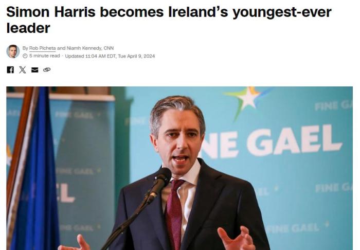 此前報(bào)道,2024年3月20日,愛(ài)爾蘭時(shí)任總理瓦拉德卡宣布,“由于個(gè)人和政治原因”辭去統(tǒng)一黨領(lǐng)袖職務(wù),并將在統(tǒng)一黨選出新領(lǐng)袖后辭去總理職務(wù)。3月24日,愛(ài)爾蘭統(tǒng)一黨表示,哈里斯當(dāng)選該黨新領(lǐng)袖,并于4月出任愛(ài)爾蘭總理。