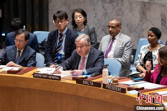 當(dāng)?shù)貢r(shí)間4月14日,聯(lián)合國(guó)安理會(huì)就伊朗襲擊以色列在紐約聯(lián)合國(guó)總部召開緊急會(huì)議。圖為聯(lián)合國(guó)秘書長(zhǎng)古特雷斯發(fā)言。 中新社記者 廖攀 攝