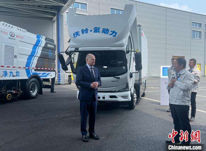 博世氫動力系統(tǒng)(重慶)有限公司是朔爾茨訪渝首站參觀地。該公司由博世與慶鈴汽車合資建立,致力于將博世氫燃料電池解決方案引入中國市場。在參訪點(diǎn)入口,四輛冷鏈物流、環(huán)衛(wèi)及牽引車等依次停放。這些車全為中國國產(chǎn)汽車,使用博世氫動力系統(tǒng)(重慶)有限公司出產(chǎn)的氫動力模塊。朔爾茨在企業(yè)相關(guān)負(fù)責(zé)人的介紹下,了解博世與中企合作的最新成果。在工作人員指引下,朔爾茨為完成預(yù)裝的氫動力模塊拴緊最后一顆螺絲,向身邊工作人員豎起了大拇指。