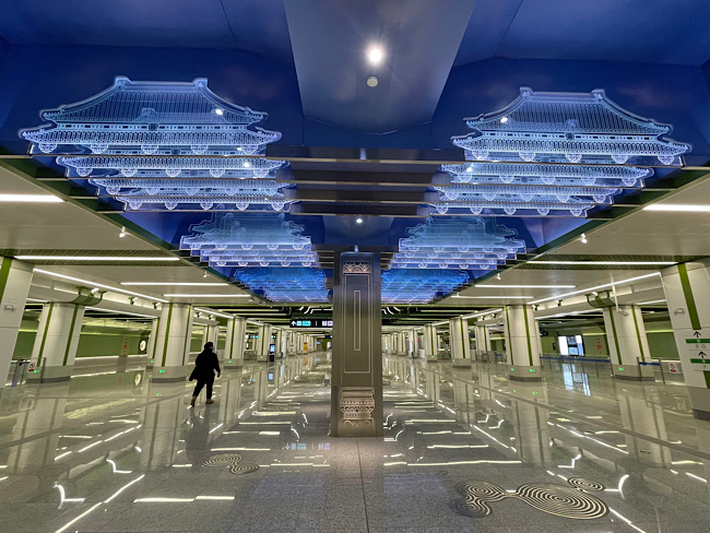 在車站裝修方面,地鐵19號線車站在裝修設(shè)計中突出“薈萃京華”的總體設(shè)計概念,在車站風(fēng)格中體現(xiàn)北京傳統(tǒng)與現(xiàn)代精華,全線站廳通道口、換乘通道及站臺樓扶梯三角房處以突出導(dǎo)向性和識別性為原則進行重點裝修。以“鳳凰于飛—鳳祥燈會”為設(shè)計主題的新發(fā)地站、繪有“雙鯉戲水”的積水潭站、加入牡丹和景泰藍元素的牡丹園站……乘客可在各站感受到多元化的“地鐵藝術(shù)”。