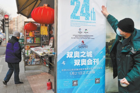 昨天上午,位于廣渠門內(nèi)大街富貴園購物中心前的郵政報刊亭旁,三位來自北京郵政的工作人員正忙碌著。很快,三張印有“雙奧之城,雙奧會刊”“北京2022年冬奧會和冬殘奧會官方中文會刊1月21日正式出版”等字樣的嶄新海報貼上了報刊亭的公益宣傳欄。以白色和藍(lán)色為主色調(diào)的主題海報剛剛貼好,就立刻吸引了過往路人的駐足觀看:“這海報真有冬奧氛圍。”“冬奧會刊?到時候得來一份看看。”不少路人掏出手機,對著海報上的預(yù)訂二維碼現(xiàn)場掃碼,了解具體情況。