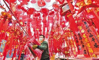 1月8日,石家莊市南三條市場(chǎng)的商戶在忙著準(zhǔn)備年貨。隨著農(nóng)歷新年的臨近,春聯(lián)、福字、燈籠、虎年生肖飾品的銷(xiāo)售行情逐日升溫。 河北日?qǐng)?bào)通訊員 張曉峰攝