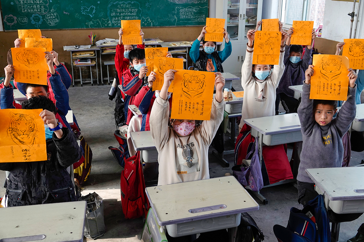 1月7日,山西省運城市新絳縣澤掌鎮(zhèn)光村小學,絳州木版年畫工藝師們帶著新創(chuàng)作的虎年生肖虎木版走進校園,同小學生們一起印制生肖虎年畫,傳承非遺民俗。