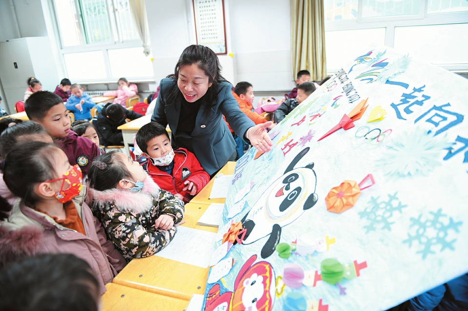 1月6日,太原市第二實驗小學,孩子們在與老師的互動中學習知識。該校積極響應(yīng)“雙減”政策,為一、二年級學生開展“巧娃迎冬奧”等主題綜合素質(zhì)大比拼,讓孩子們在動手、動腦、小組合作中輕松快樂地開展自主、合作、探究性學習。(記者阮洋攝)