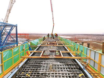 本報訊(記者 劉洋)1月12日,京雄高速公路(北京段)全線重點控制性工程永定河特大橋再傳捷報,經(jīng)過16個小時的晝夜作戰(zhàn),作為京雄高速公路全線最大蓋梁的永定河特大橋西引橋20#墩蓋梁順利澆筑完成,這標志著永定河特大橋的上部結(jié)構(gòu)施工帷幕業(yè)已拉開。