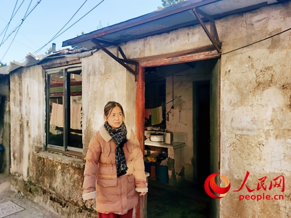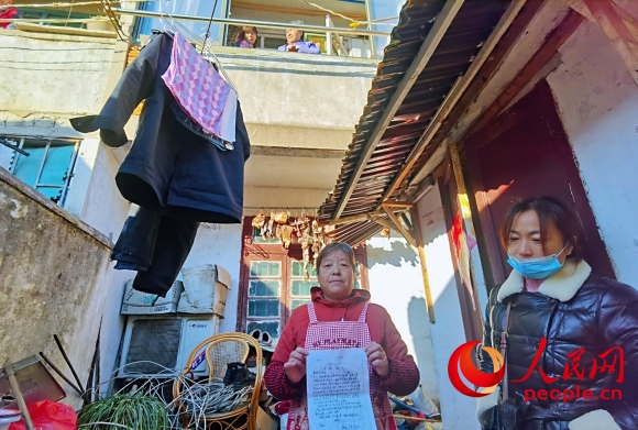 樓房住戶林菊芬(左)稱不久前樓上掉下水泥塊,“住得提心吊膽”。人民網記者 王繼亮攝