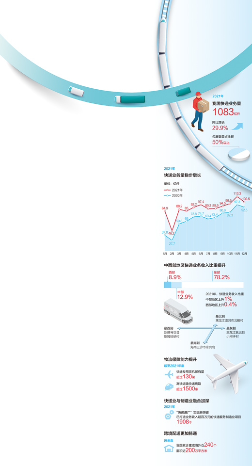 記者從國家郵政局獲悉,2021年全年,我國快遞業(yè)務(wù)量達(dá)1083億件,同比增長29.9%,包裹數(shù)量占全球一半以上。