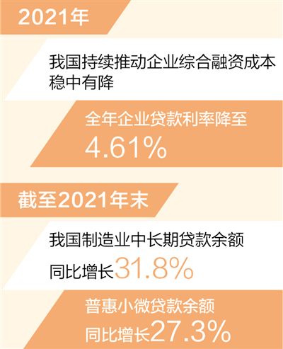 本報北京1月18日電 (記者吳秋余)中國人民銀行發(fā)布的最新數(shù)據(jù)顯示,2021年我國持續(xù)推動企業(yè)綜合融資成本穩(wěn)中有降,全年企業(yè)貸款利率降至4.61%,比2020年下降0.1個百分點,比2019年下降0.69個百分點,是改革開放40多年來最低水平。