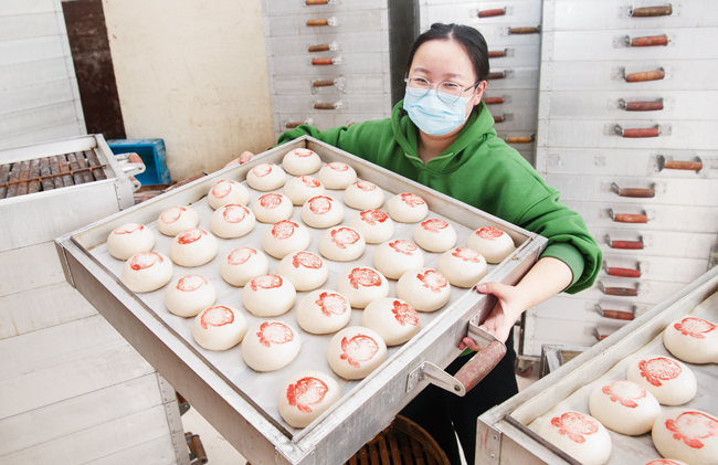 1月23日,金華市金東區(qū)赤松鎮(zhèn)仙橋饅頭店里熱氣騰騰,員工給剛蒸好的饅頭上蓋上紅印,寓意著新年“團(tuán)團(tuán)圓圓、蒸蒸日上”。隨著新春佳節(jié)臨近,赤松鎮(zhèn)仙橋各家饅頭店迎來了節(jié)前銷售高峰,饅頭夾扣肉、夾臭豆腐被稱作“金華漢堡”,成為春節(jié)餐桌上一道地方特色餐點(diǎn)。益泰饅頭店主人錢建濤表示,銷量主要集中在春節(jié)前一星期左右,晝夜不停一天要做5萬只以上。(時(shí)寬兵)