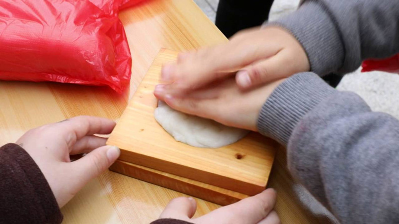 小朋友將糕團(tuán)放入模具中壓印,年糕就制作出來(lái)了。有的小朋友則直接用手將糕團(tuán)捏成各式各樣的造型,別有一番樂(lè)趣。