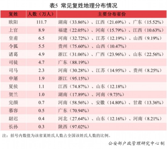 復(fù)姓“歐陽”33.86%的人口分布在湖南;復(fù)姓“皇甫”32.72%的人口分布在河南;復(fù)姓“諸葛”31.06%的人口分布在浙江;復(fù)姓“司徒”88.19%的人口分布在廣東;復(fù)姓“司馬”30.28%的人口分布在河南;復(fù)姓“夏侯”74.87%的人口分布在江西。