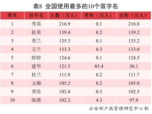 全國戶籍人口中,使用頻率最高的10個雙字名依次為:秀英、桂英、秀蘭、玉蘭、婷婷、建華、桂蘭、玉梅、秀珍、海燕。其中“秀英”名列榜首,使用人數(shù)為216.9萬。