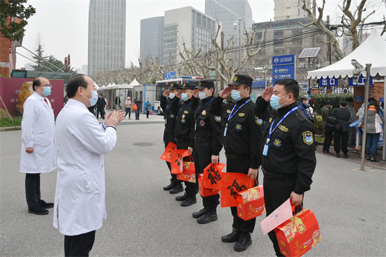 胸科醫(yī)院院領(lǐng)導(dǎo)慰問(wèn)保安崗一線工作人員(上海胸科醫(yī)院供圖)