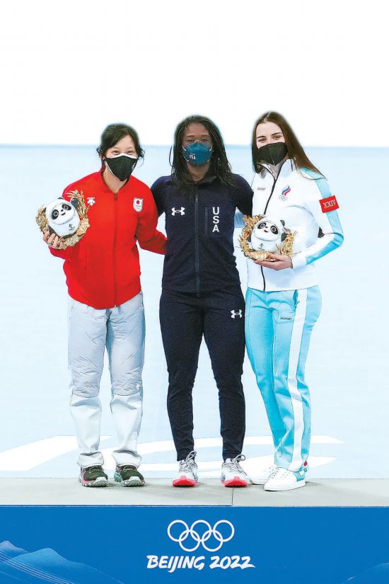 2月13日,北京2022年冬奧會速度滑冰女子500米決賽冠亞季軍選手合影。本報記者 鄧偉攝