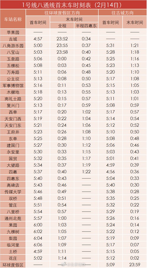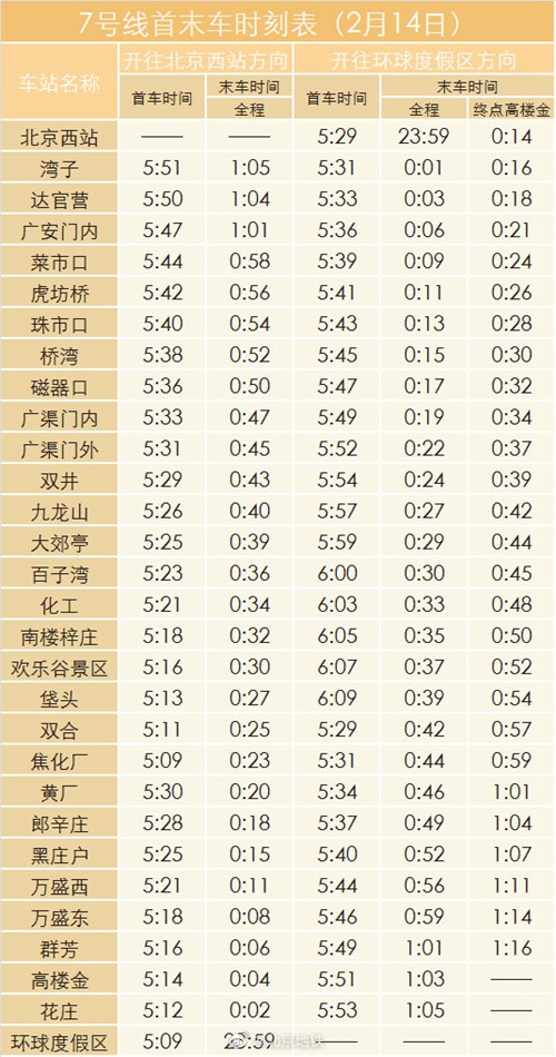 2月14日晚北京地鐵1號線八通線、2號線、7號線延長運營時間