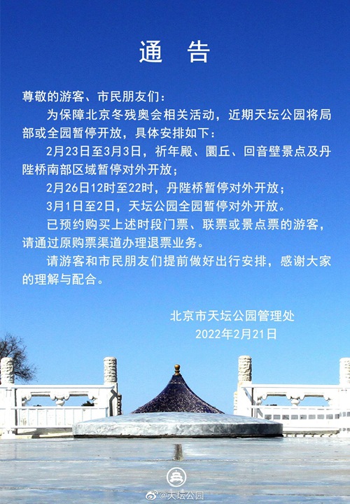 人民網北京2月22日電 2月21日,天壇公園管理處發(fā)布通告稱,為保障北京冬殘奧會相關活動,近期天壇公園將局部或全園暫停開放。