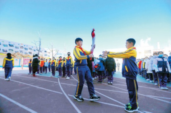 操場(chǎng)上,一場(chǎng)模擬火炬?zhèn)鬟f儀式開始了。孩子們高舉火炬,神采奕奕。薛東說,這支火炬將入藏該校的“小小冬奧博物館”,成為該校冬奧教育的一部分。