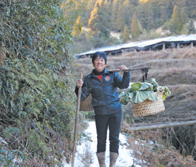 官兵們駐扎的大山峰平均海拔1000米左右,山路崎嶇陡峭,僅能容一人通過,單程就要一個(gè)多小時(shí)。葉美英每周上山兩次,一條扁擔(dān),一根木杖,扁擔(dān)兩端的筐里裝滿了自家種的青菜、包菜、茄子。最多的時(shí)候,這條磨得發(fā)黑的扁擔(dān)上挑過重達(dá)140斤的蔬菜。挑累了,葉美英就用木杖支撐著扁擔(dān),簡(jiǎn)單休息之后,繼續(xù)上山。