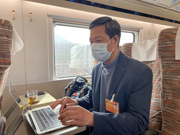 3月3日,赴京參會(huì)途中,全國(guó)人大代表佘才高、李鴻彬交流建議修改情況。鹿偉攝