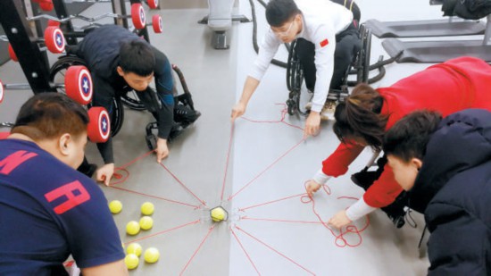 徐守森(右一)帶領輪椅冰壺運動員通過互動游戲緩解比賽壓力。