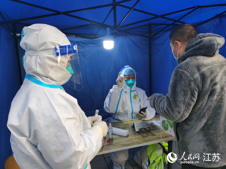 2月27日一早6點多,在吳江區(qū)松陵街道水秀社區(qū),王新(中)為前來采樣的市民登錄個人信息。人民網(wǎng)記者 王繼亮攝