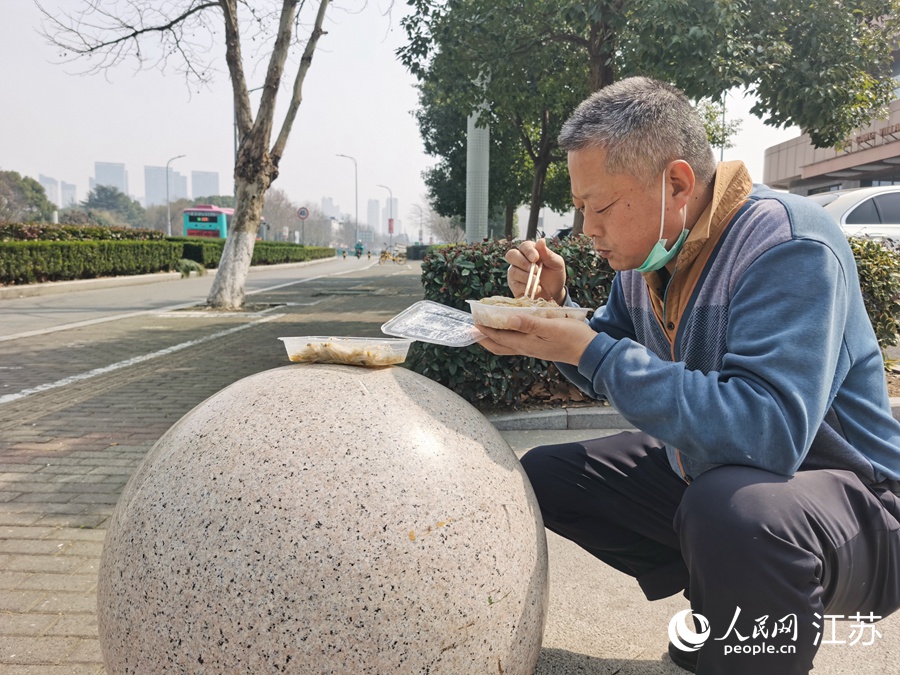 3月2日,忙完志愿服務(wù)工作后,王新買了一份快餐。由于禁止堂食,他蹲在路邊吃了起來。人民網(wǎng)記者 王繼亮攝