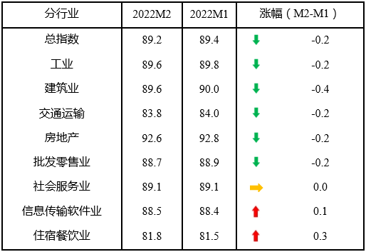 企業(yè)效益有待提升。由于國內(nèi)穩(wěn)增長預(yù)期上升及俄烏沖突,國際能源、原材料等大宗商品價格反彈,但消費恢復(fù)偏弱,上下游行業(yè)利潤分化加劇,小微企業(yè)利潤承壓。2月效益指數(shù)為74.4,比上月下降0.5點,仍為8個分項指數(shù)中的最低值,處于歷史較低位。所調(diào)查的8個行業(yè)中,5個行業(yè)效益指數(shù)下降。