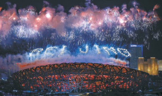 “BEIJING”“北京2022”綻放鳥巢上空