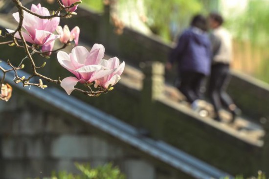 3月13日下午,嘉興海寧市區(qū)市河中心的“口袋公園”小蕩公園春色撩人,粉色的玉蘭花、白色的櫻花點(diǎn)綴其中,吸引市民前來打卡。(石月平)