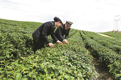 海關(guān)關(guān)員在茶葉種植基地查看農(nóng)事活動