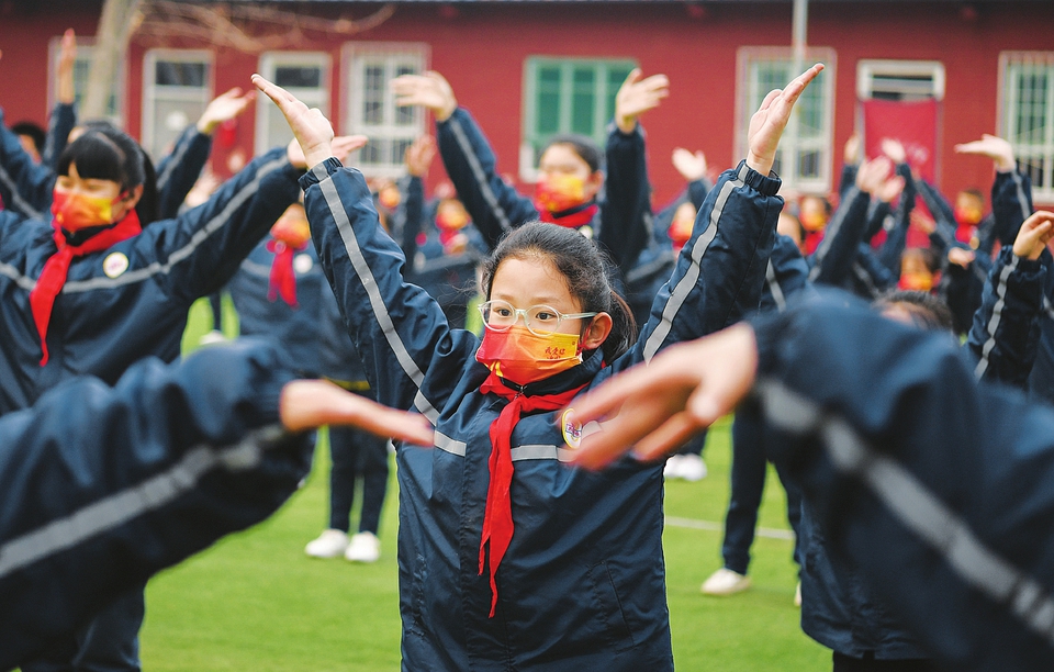 3月24日,臨汾市興國(guó)實(shí)驗(yàn)小學(xué),師生們?cè)谡n間跳律動(dòng)減壓操。連日來(lái),該校結(jié)合閉環(huán)管理,為全校師生量身編排了律動(dòng)減壓操和手舞操,使學(xué)生快樂(lè)學(xué)習(xí)、健康生活。(閆銳鵬攝)