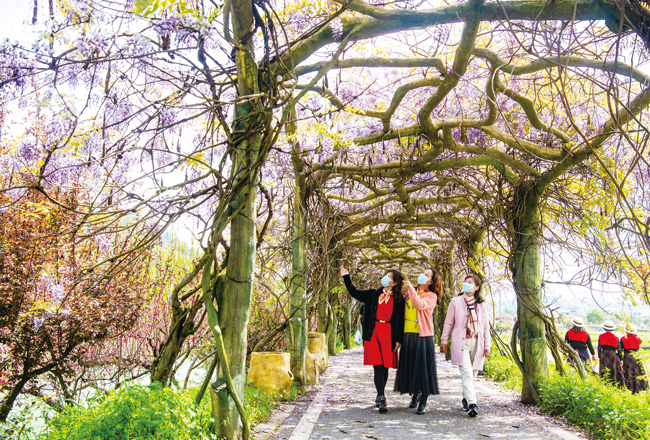 3月29日,在金華市金東區(qū)嶺下鎮(zhèn)釜章村,位于八仙溪邊的百米紫藤長廊花朵綻放,紫藤花從花架垂掛下來,像一串串紫色風(fēng)鈴,吸引了一撥撥游客趁著春光明媚的好天氣前來觀賞拍照。(時寬兵)