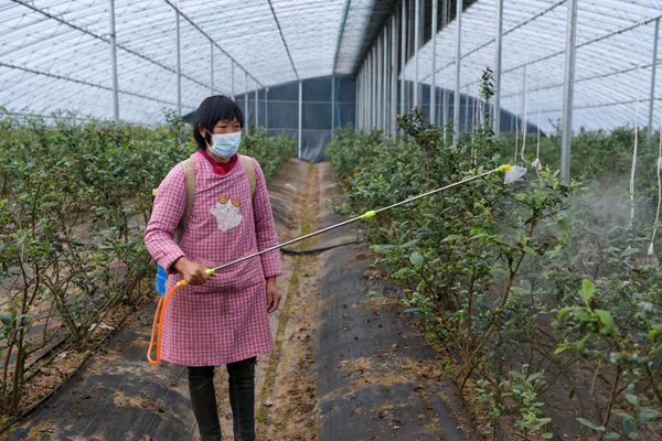 村民在大興鎮(zhèn)藍(lán)莓專業(yè)種植合作社溫室大棚里管護藍(lán)莓