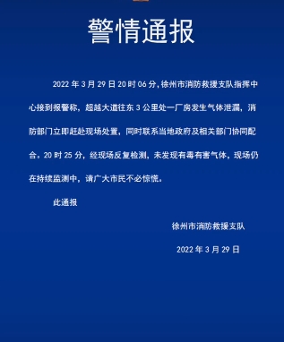 徐州市消防救援支隊在當晚24時左右發(fā)布的警情通報中表示,3月29日20時06分,徐州市消防救援支隊指揮中心接到報警稱,超越大道往東3公里處一廠房發(fā)生氣體泄露,消防部門立即趕赴現(xiàn)場處置,同時聯(lián)系當?shù)卣跋嚓P(guān)部門協(xié)同配合。20時25分,經(jīng)現(xiàn)場反復檢測,未發(fā)現(xiàn)有毒有害氣體,現(xiàn)場仍在持續(xù)監(jiān)測中。