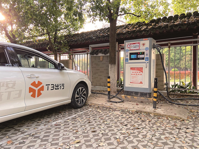 南京寶船聽濤廣場內(nèi),一輛新能源網(wǎng)約車正在充電。董翔 攝