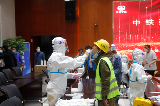建設(shè)者在湖杭鐵路杭州西站指揮部大會(huì)議室內(nèi)做核酸檢測(cè)。周蕊攝