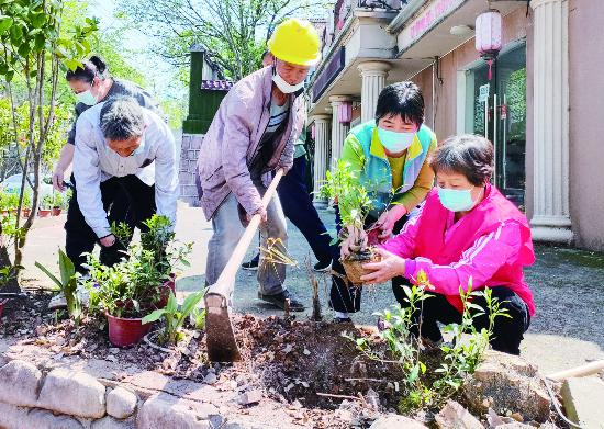 近日,金華市區(qū)城中街道楊思嶺社區(qū)企退人員、黨員志愿者開展“愛心植樹、綠色環(huán)?!睂?shí)踐活動(dòng),在公共花壇泥土裸露的地方,補(bǔ)栽梔子花、風(fēng)尾花等花卉,美化社區(qū)環(huán)境。(時(shí)寬兵)
