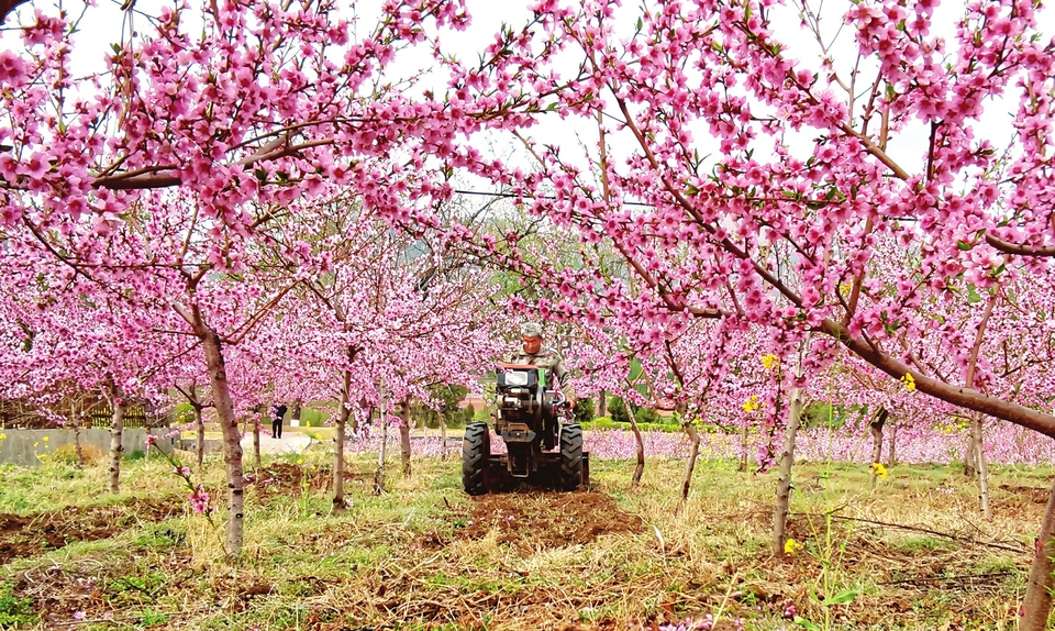 4月12日,左權(quán)縣上武村百畝桃園花開太行,農(nóng)民正在使用拖拉機(jī)松土施肥耕作管護(hù)。上武村地處太行百里畫廊的核心區(qū)域,近年來,該村積極推動(dòng)農(nóng)旅融合,發(fā)展生態(tài)旅游,每到春天,連片的桃花競(jìng)相綻放、美如云霞,構(gòu)成一幅太行田園風(fēng)光圖,吸引了游客踏青賞春,促進(jìn)了產(chǎn)業(yè)發(fā)展農(nóng)民增收。(邢蘭富攝)