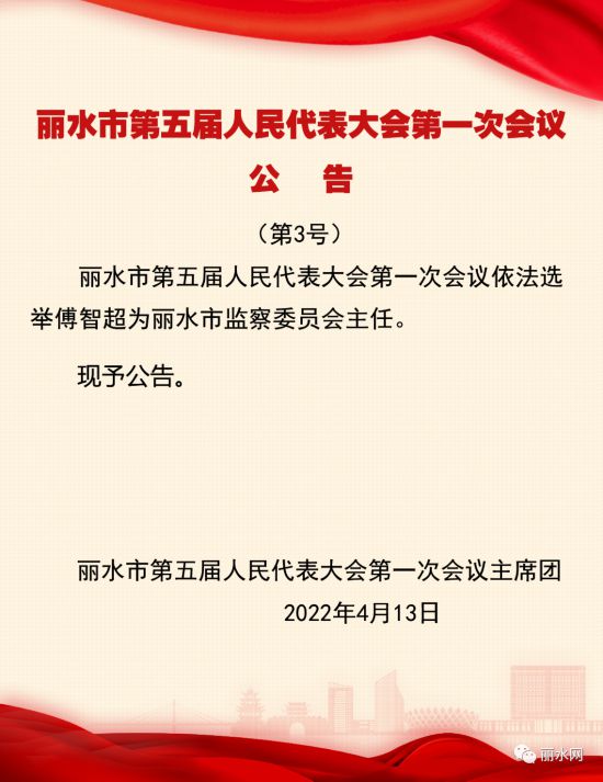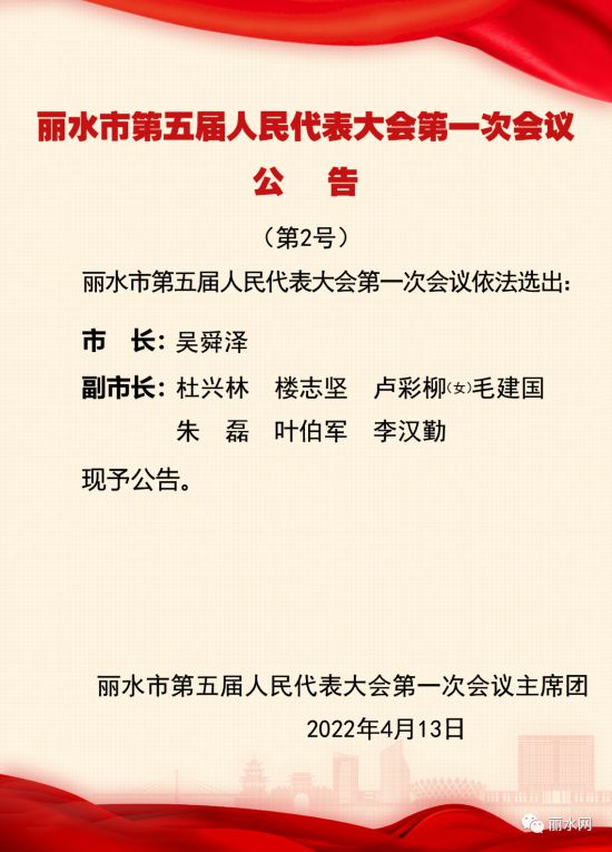 4月13日上午,麗水市五屆人大一次會(huì)議舉行第三次全體會(huì)議,選舉產(chǎn)生麗水市人大常委會(huì)主任、副主任、秘書長(zhǎng)和委員,麗水市人民政府市長(zhǎng)、副市長(zhǎng),麗水市監(jiān)察委員會(huì)主任,麗水市中級(jí)人民法院院長(zhǎng),麗水市人民檢察院檢察長(zhǎng)。