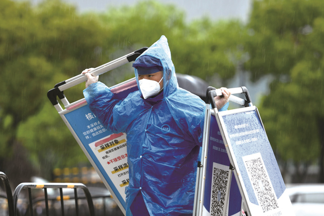 4月13日,在嘉興市區(qū)三元路上的新嘉街道核酸采樣點,來自嘉興藍天救援隊的志愿者們在大雨中堅守,協(xié)助完成核酸采樣。(王振宇)