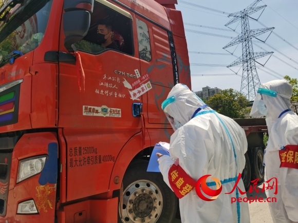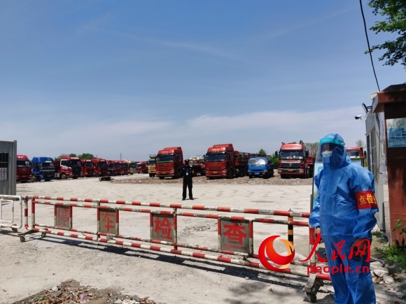 工作人員對(duì)外來(lái)貨車及駕乘人員進(jìn)行信息登記。人民網(wǎng)記者 王繼亮攝